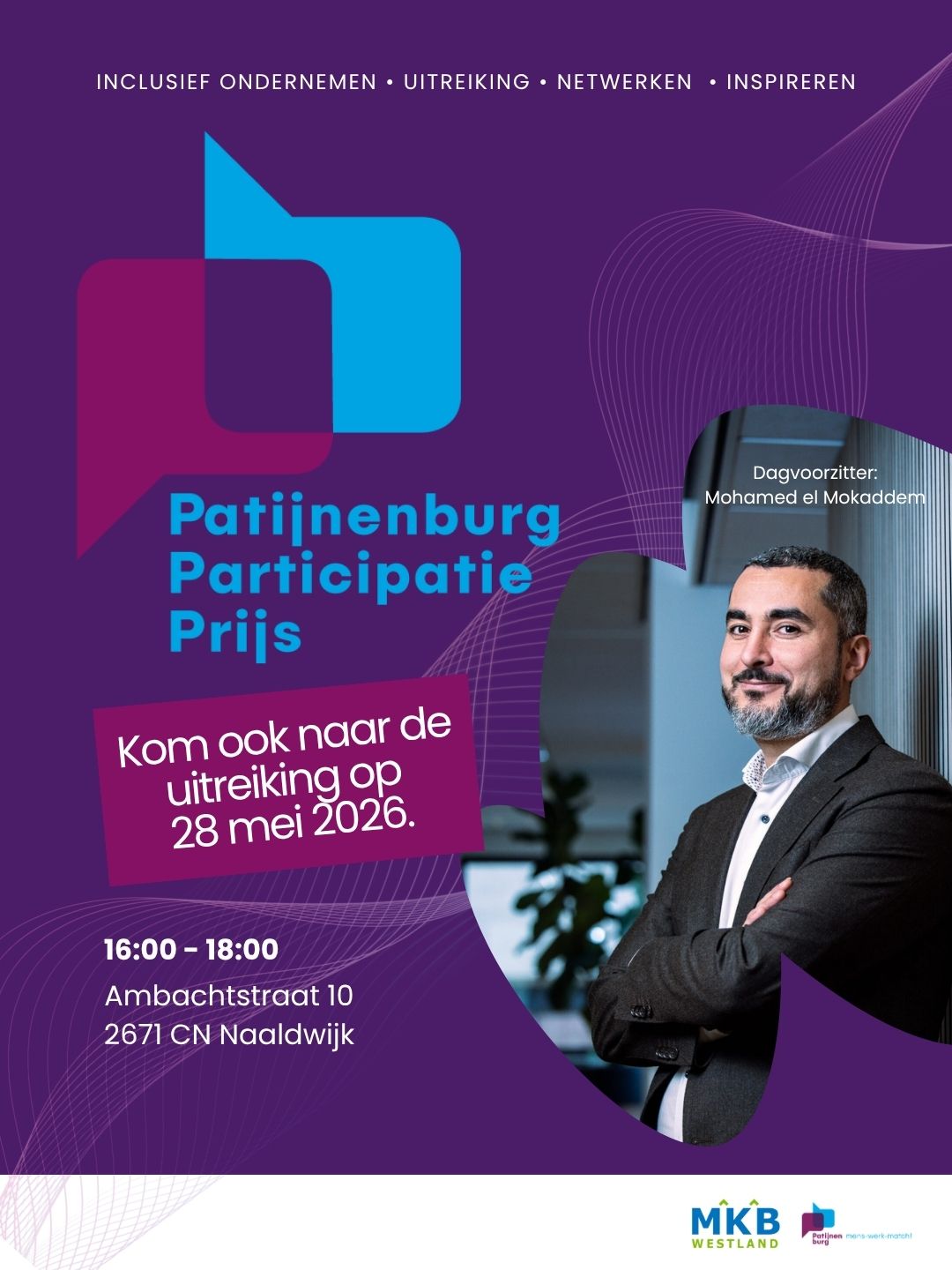 Bekendmaking winnaar 28 mei 2026 MKB Westland en Patijnenburg organiseren jaarlijks de Patijnenburg Participatie Prijs om participatie en diversiteit in Westlandse bedrijven te versterken. Het event combineert inspiratie, ontmoeting en erkenning: ondernemers krijgen handvatten om inclusief ondernemen toe te passen en de meest inspirerende ondernemer ontvangt de Patijnenburg Participatie Prijs. Het evenement creëert bewustzijn, stimuleert […]